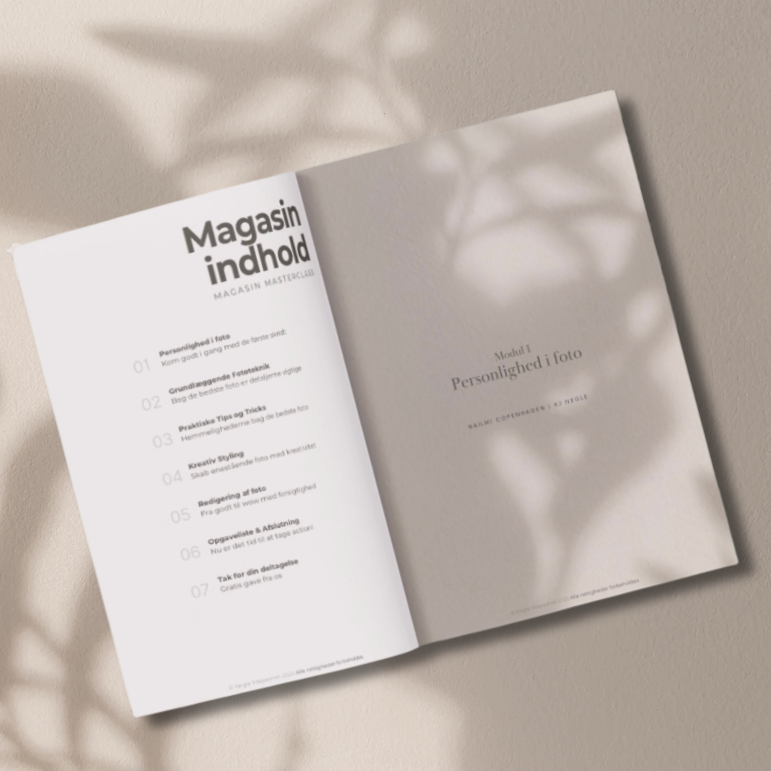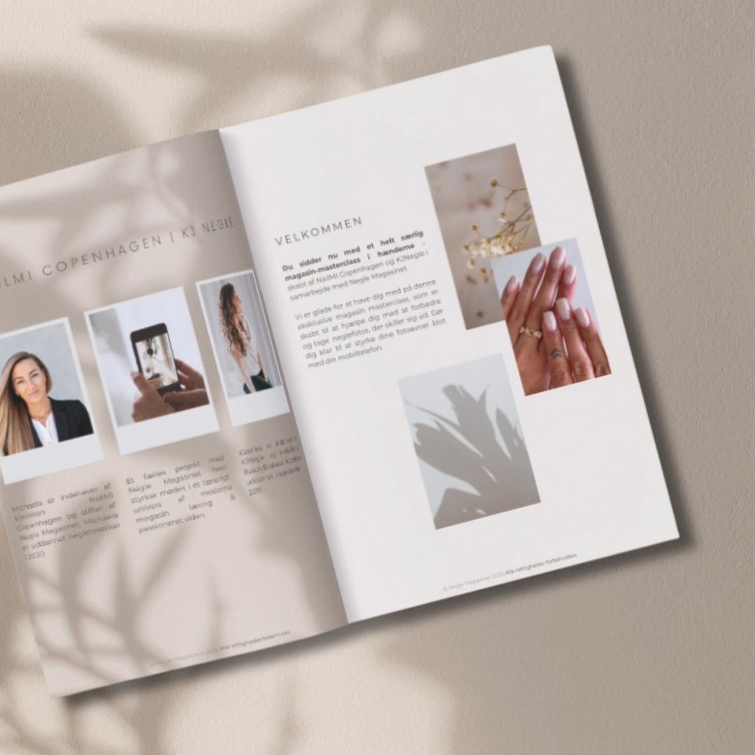 Neglefotos – Fra Begynder til Pro! er skabt af Katerina Jørgensen (KJNegle) og Michaela Raavig (Nailmi-Copenhagen) i samarbejde med Negle Magasinet, og er et eksklusivt 60-siders fysisk magasin designet til at udvikle dine fotoevner som negletekniker.